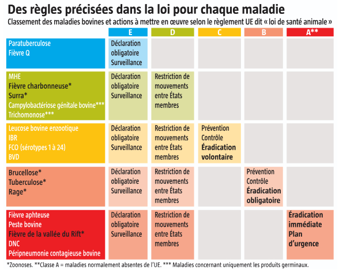 L’organisation sanitaire animale a vécu un tournant en France lors des états généraux du sanitaire en 2010, qui ont renforcé les rôles des GTV et GDS. Elle a été complétée par un règlement européen en 2021, connu sous le nom de « loi de santé animale ». Ce texte hiérarchise et classifie les maladies en fonction de leur impact sanitaire (voir l’infographie ci-contre). Il définit aussi les règles à respecter obligatoirement pour chacune. Le premier pilier de la réglementation européenne repose sur la surveillance par les détenteurs d’animaux. Les éleveurs se trouvent en première ligne pour identifier les animaux malades. Il leur revient de donner l’alerte en appelant leur vétérinaire quand ils se trouvent face à un cas inhabituel. Sans ce signalement, la maladie va s’étendre.