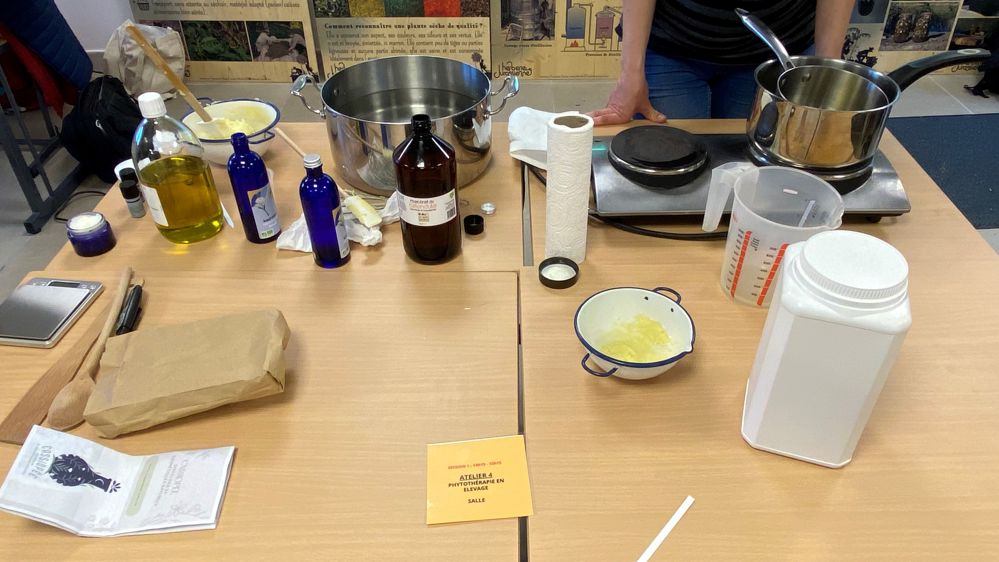 Dans ce cadre, des sessions de formations et des groupes d’échanges ont été organisés auprès des éleveurs bovins autour des soins alternatifs du troupeau. À l’occasion d’un atelier de restitution de ces travaux, Jean-Marc Bouvier, pharmacien à Damprichard (Doubs), a présenté la fabrication d’un baume phytothérapeutique applicable sur la mamelle et les trayons, pour aider la peau à mieux cicatriser, calmer les irritations et nourrir l’épiderme tout en assurant localement l’asepsie (éviter la prolifération bactérienne sur une plaie).