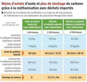 Outre les résultats obtenus dans le projet MétaMétha à l’échelle parcellaire (à nuancer en raison des contraintes expérimentales), des simulations par modélisation ont été réalisées pour estimer l’effet sur les bilans carbone et azote de l’introduction de la méthanisation à l’échelle d’une exploitation de polyculture-élevage bovin lait de 300 ha. Trois scénarios ont été testés : lisier et fumier bovin sans méthaniseur ; déchets à majorité agricole (62 %) avec méthaniseur ; déchets à majorité urbains et industriels (70 %) avec méthaniseur. Les simulations sur vingt ans montrent les effets positifs de l’importation de déchets extérieurs sur le stockage de carbone dans les sols, ainsi qu’une réduction des achats d’azote de synthèse d’ environ 10 à 30 % (voir le tableau ci-dessus).