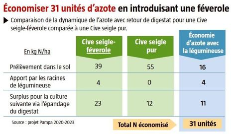 Dans un but agroécologique, l’idée est plutôt d’être dans une dynamique circulaire de recyclage des éléments nutritifs, via notamment l’apport de digestat. Cette économie d’intrants était l’un des objectifs recherchés par la chambre régionale d’agriculture Nouvelle-Aquitaine dans son projet Pampa visant à « Promouvoir agroécologie et méthanisation par les associations culturales ». Des essais ont été réalisés pour mesurer l’intérêt d’intégrer des légumineuses (féverole, vesce) dans une Cive à base de céréale (seigle, triticale) avec plusieurs modalités de fertilisation azotée. Les résultats montrent que, en l’absence de fertilisation, les rendements obtenus sont supérieurs en présence de féverole. La diversification de la composition de la Cive peut aussi être un moyen de sécuriser le rendement.