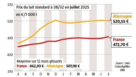 En juillet, l’écart moyen entre les deux pays reste élevé : 45,96 €/1 000 l au profit des Allemands (période d’août 2024 à juillet 2025). Si les prix d’août sont stables, comme les Français, ils s’interrogent sur le prix du lait des mois à venir. Les regards convergent vers le marché du beurre, dont les cotations Spot ont perdu 2 000 €/t sur plus de deux mois.