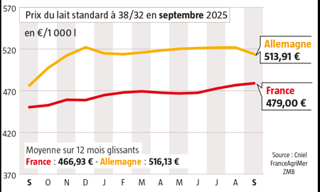 L’écart entre les prix français et allemand est, en moyenne, de 50 €/1 000 l. Cette trésorerie supplémentaire accumulée par les Allemands les aidera plus facilement à passer le cap de la baisse du prix du lait.