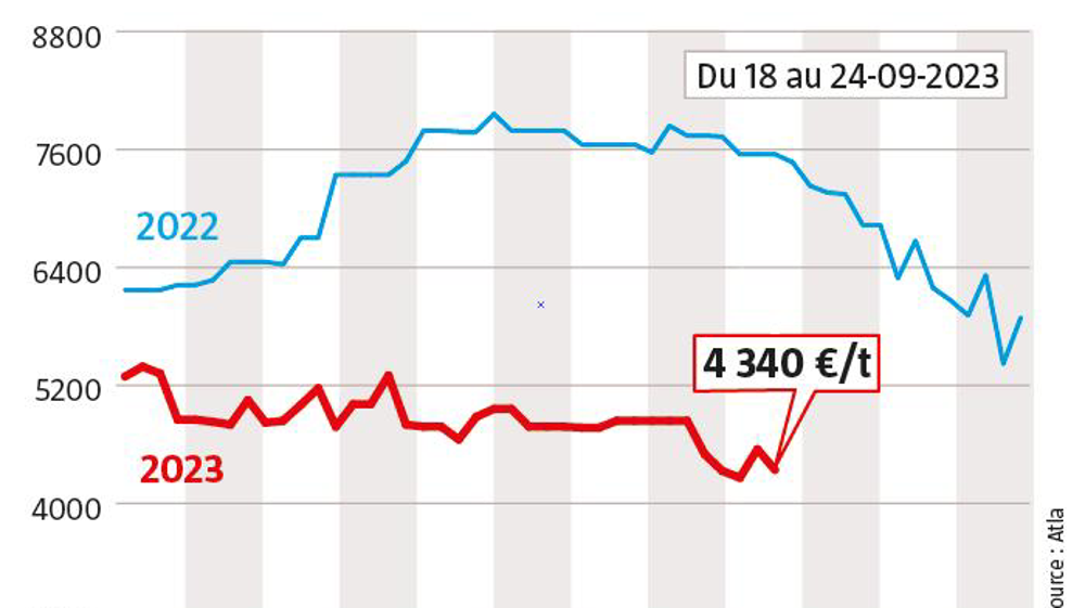 Aux États-Unis, la collecte recule depuis juillet. La conjoncture y est morose ce qui amène l’USDA a annoncé une production nationale en hausse de seulement 0,4 % par rapport à 2022. La Nouvelle-Zélande se projette sur un marché compliqué avec un prix aux producteurs de fait plutôt bas, accompagné de craintes sur le plan climatique (phénomène El Niño). L’Europe reste plutôt en légère hausse côté collecte. L’Allemagne ou les Pays-Bas produisent toujours plus, même si un ralentissement se fait sentir. La France, elle, décroche. Et les prix payés aux producteurs baissent en Europe sauf, là encore, en France ce qui ne stimule cependant pas la production laitière du pays.