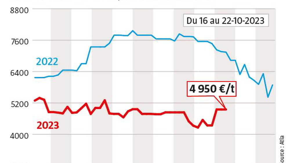 Sur le plan mondial, les acheteurs préfèrent sécuriser leurs volumes avec une collecte en Europe et en Nouvelle-Zélande pas vraiment florissante. Les marchés remontent un peu avec un retour de la demande. La poudre maigre trouve preneur auprès du Moyen-Orient, de l’Afrique et du Sud-Est asiatique. Les tendances du mois dernier se confirment donc. D’ailleurs, Fonterra revoit ses prévisions de prix légèrement à la hausse début octobre. Un retour des acheteurs asiatiques pourrait bien se profiler à l’horizon. De plus, la pousse de l’herbe dans le pays n’est pas au rendez- vous par rapport aux années précédentes. Aux États-Unis, la collecte s’est tenue en septembre et a rejoint celle de 2022, avec un dépassement possible pour les mois à venir. Les marges sont meilleures pour les éleveurs, avec moins de réformes. Côté beurre, au cours des dernières semaines, les prix ont fortement augmenté (de 5 100 €/t en juillet à environ 7 150 €/t le 6 octobre sur le marché de Chicago). Une hausse temporaire liée à Thanksgiving. En Europe, le contexte est différent pour le beurre avec une stabilité depuis plusieurs semaines. Les prix des produits laitiers baissent légèrement en GMS et les consommateurs reviennent aux achats, comme cela s’observait déjà en Allemagne le mois dernier, mais sans réel impact sur les cours des produits industriels.