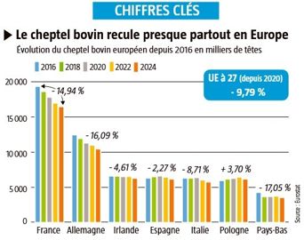 L’Union européenne a perdu 2,7 millions de vaches entre 2016 et 2024, dont 2 millions de vaches laitières. Selon les prévisions de la Commission européenne, elle en perdra encore autant, voire plus, d’ici à 2035 (environ 2,9 millions). Le recul s’établit à 1 % par an en vaches laitières et 0,7 % en vaches allaitantes. Cela induit une baisse mécanique du nombre de veaux pouvant être engraissés.