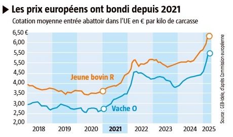 L’envolée des prix s’est accentuée en 2025 en raison des problèmes sanitaires. FCO et MHE dégradent les performances à la reproduction et augmentent la mortalité. Ces maladies retardent et réduisent l’arrivée des veaux, elles incitent les éleveurs à garder leurs vaches. « Sur la dernière campagne, en France, il y a eu 216 000 naissances en moins dans les troupeaux allaitants, soit 6,6 % de baisse en un an », constate Caroline Monniot.