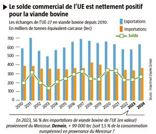 « Nous exportons aussi, donc nous ne sommes pas contre les accords de libre-échange, explique Emmanuel Bernard, président de la section bovine d’Interbev. Mais les importations doivent respecter nos règles. » Il garde l’espoir que le traité ne soit pas ratifié et estime que le modèle d’élevage français, qui fournit une viande de qualité et crée de nombreux emplois ruraux, doit être protégé. Il s’inquiète de voir la Commission européenne introduire une compensation de déstabilisation des marchés dans la Pac 2027. Comme si elle anticipait des dégradations.