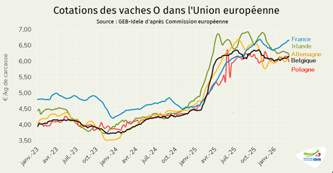 La faiblesse des abattages se poursuit en 2026 ce qui soutient les cours des vaches O en Europe à des niveaux trés élevés. La France affiche notamment le plus haut prix.