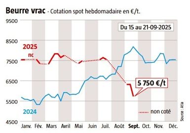 En France, l’offre de beurre est désormais plus abondante, à la suite de fabrications importantes, depuis le début de l’année, commençant à peser sur les cours dès la fin de l’été. En semaine 38, la cotation Atla du beurre sur le marché Spot atteignait 5 750 €/tonne, en baisse de 1 430 € sur les six dernières semaines. Plus globalement sur le plan européen, les pays champions de la production de beurre au premier semestre ont été : l’Allemagne (+ 4,7 % à 268 kt), la France (+ 1,6 % à 216 kt), l’Irlande (+ 4,7 % à 137 kt) et la Pologne (+ 3,4 % à 137 kt). L’Institut de l’élevage constate cependant que, « au sein du top 5, seuls les Pays-Bas ont vu leur production reculer fortement (- 11 % à 57 kt) ». Mais, malgré ces fabrications, un fait notable s’est produit depuis le début de l’année : la Nouvelle-Zélande est devenue le premier fournisseur de beurre de l’Union européenne en multipliant par neuf ses exportations par rapport à 2024, remplissant les contingents de l’accord de libre-échange (presque 80 % du contingent remplis au 1er juin 2025, contre 27,5 % sur l’année 2024, soit respectivement 5 110 t contre 927 t), et dépasse le Royaume-Uni (+ 7 %), pourtant « partenaire historique ». L’Ukraine se positionne en troisième fournisseur (x 9 à 5,4 kt) du fait également d’un accès préférentiel au marché. Et les États-Unis ont aussi approvisionné l’UE en beurre, arrivant à la quatrième place, une situation inédite.