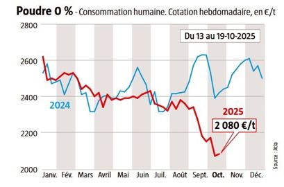 Pour la poudre maigre, les exportations cumulées des principaux exportateurs étaient en retrait depuis le début de l’année. Seule l’UE à 27 a vu ses exportations croître sur un an (+ 4 % versus 2024). Côté prix, les cotations de la poudre maigre étaient orientées à la baisse en Nouvelle-Zélande en septembre (- 12 % par rapport à août 2025 et - 10 % par rapport à septembre 2024, à 2 254 €/t) comme dans l’UE. Aux États-Unis, les rapports de l’USDA de fin septembre « faisaient état de prix de la poudre de lait écrémé en baisse dans un contexte de demande en déclin et de production toujours soutenue », selon l’Idele. Ce dernier constate également que « la compétitivité de la poudre maigre européenne restait affectée par la vigueur de l’euro ».