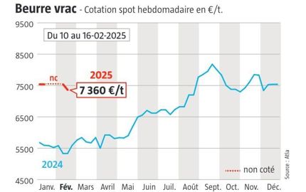 Dans l’Union européenne, ils étaient cependant orientés à la baisse (- 4 %/décembre 2024, mais + 36 %/janvier 2024, à 7 420 €/t) du fait « d’un rattrapage partiel du mouvement de baisse observé ailleurs au début du second semestre 2024 », selon l’Idele. Les prix ont donc légèrement reculé, mais restent élevés pour la saison. L’Atla n’a pas coté pendant plusieurs semaines, faute de représentativité en lien avec un nombre d’acheteurs insuffisant, et la cotation en semaine 7 était en baisse (- 180 €/t). Il est possible que les acheteurs soient un peu attentistes, espérant encore une nouvelle baisse.