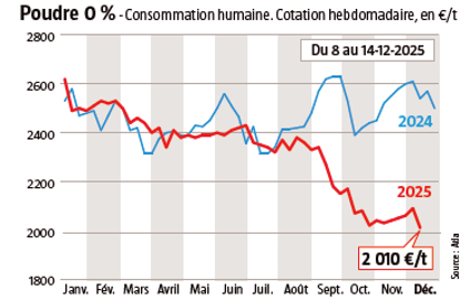 L’Argentine produit beaucoup, contrairement à d’autres années, avec l’Uruguay. Une situation liée à la stabilisation économique du pays à travers sa monnaie, à de bonnes conditions climatiques et à des prix suffisamment incitatifs à l’export mais aussi pour les éleveurs. Aux États-Unis, malgré un prix en baisse, les éleveurs continuent de produire car l’aliment est lui aussi en baisse. « Un effet d’annonce de plus ? » s’interroge Baptiste Buczinski au sujet des annonces de Donald Trump pour un soutien de 12 Md$ aux agriculteurs américains. Trop de lait donc et des prix qui chutent pour les poudres, le beurre et même les fromages. « Les prix du gouda et du cheddar, fromages exports, chutent également », relève l’économiste. L’année 2026 s’annonce plus compliquée, au moins pour le premier semestre.