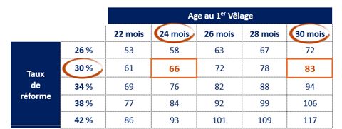 Dans tous les cas, mathématiquement, la diminution de l’âge au premier vêlage réduit le nombre de génisses présentes sur l’exploitation. Par exemple, pour un élevage de 100 vaches avec un taux de réforme de 30 %, le passage d’un âge au 1er vêlage de 30 à 24 mois réduit le nombre de génisses présentes de 83 à 66. (Cf tableau ci-dessous)