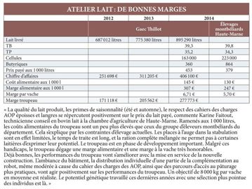 « Le prix de base s'est élevé à 320 € ce premier semestre, soit 60 € de moins que l'an passé, note Franck, par ailleurs vice-président du syndicat de défense de l'AOP époisses. Même en AOP époisses, se déconnecter du marché du lait industriel beurre-poudre reste difficile quand seulement 50 à 68 % du lait collecté selon les périodes de l'année est valorisé en AOP. » Optimiste, Franck veut croire que les prix repartiront à la hausse. En attendant, la mise en service du nouveau bâtiment devrait avoir un impact positif sur les performances du troupeau. Partis en 2004 avec des montbéliardes à 5 000 kg sans IA, les éleveurs ont travaillé ces dernières années la génétique de leur troupeau. En mai dernier, avec les vaches au pâturage et de l'herbe fraîche, le niveau de production relevé par le contrôle laitier s'est élevé à 9 200 kg par vache. En 2014, la moyenne d'étable est montée à un bon 7 500 kg, niveau raisonnable en AOP, avec un TB de 39,3 et un TP de 35,2 en 2014. Un critère que les éleveurs ont sélectionné en cohérence avec les exigences du cahier des charges. « Celui-ci oblige à utiliser au moins 50 % de taureaux améliorateurs en TP, précise Franck. En 2013-2014, sur 112 inséminations fécondantes, 85 ont été réalisées avec des taureaux améliorateurs en TP. On regarde aussi le lait et les cellules. Avec le robot, un niveau de production individuelle de 8 000 kg est facilement atteignable. Aller au-delà n'a pas d'intérêt. Avec des vaches à plus de 9 000 kg, il faudrait donner davantage de concentré, et on ne tiendrait pas le cahier des charges. »