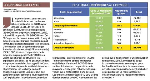 Au Gaec La Madeleine, le coût annuel des automoteurs en 2014 s'est élevé à 18 613 €. Cette facture inclut 500 heures de tracteur et 150 heures de télescopique, et englobe aussi le matériel de transport, d'épandage et de travail du sol. Les postes récolte et semis se sont élevés à 10 352 € pour la même période. La désileuse automotrice est facturée 30 €/h à laquelle s'ajoute un forfait annuel de 7 € pour 1 000 l de lait produit. Cela a coûté 7 564 € au Gaec en 2014, soit un prix de revient de 11,64 €/1 000 l. Un tarif un peu supérieur à la moyenne régionale, puisque le réseau des Cuma estime qu'une automotrice sans chauffeur revient aux environs de 10 €/1 000 l. Mais dans le cas présent, la désileuse ne fonctionne que sur trois exploitations. Il serait possible de réduire ce coût si le groupe s'agrandissait. Au final, les charges de mécanisation restent faibles. Le Gaec n'a pas d'investissement en matériel et les coûts d'entretien sont mutualisés.