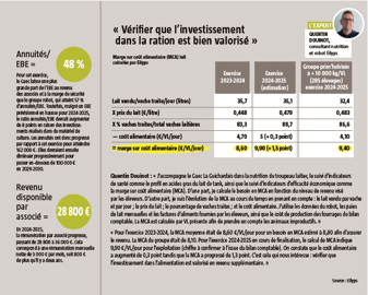 Les associés le reconnaissent : « Nous pouvons nous permettre de fabriquer une telle ration, un peu coûteuse, grâce au prix du lait actuel. » En outre, leur système intensif ne leur donne pas droit à l’erreur quant à la couverture alimentaire des besoins des animaux. Ils doivent notamment être particulièrement attentifs au management de la reproduction. L’IVV actuel est de 390 jours et le taux de réussite à la première IA est de 35-40 % pour l’ensemble du troupeau. L’élevage est équipé de colliers de détection de chaleurs, mais leur effet est limité car les vaches du troupeau les expriment peu. « Nous n’avons pas identifié l’origine du problème, sachant qu’elle peut être multifactorielle, précise Quentin Douinot. Selon moi, ce n’est pas lié au niveau de production car d’autres élevages hauts en production ne rencontrent pas ce problème. »