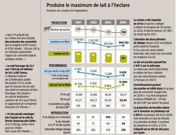 « Sur les 530 000 litres contractualisés, il fallait en livrer 30 % entre octobre et janvier. Depuis 2023, qui est la première année sans ce contrat, les vêlages sont groupés au printemps. Nous avons atteint les 100 % en six semaines cette année-là et les 96 % en 2024 [voir l’infographie, ci-dessous] », détaille-t-il. Parallèlement, 180 000 l de quotas sont achetés, en moyenne entre 1,20 € et 1,50 €/l. Leur suppression en 2015 marque un vrai tournant. Dans les pas de la politique irlandaise, qui affiche l’ambition d’augmenter la production laitière de 50 % entre 2012 et 2020, le père et le fils font mieux : + 80 % en cinq ans, atteignant 1,33 Ml en 2021. « À mesure que nous augmentions, nous achetions des parts sociales à notre coopérative Barryroe », dit John, qui en est le président.