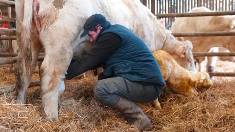 2. Il trait ses Charolaises à chaque vêlage et drenche les veaux pour un bon démarrage