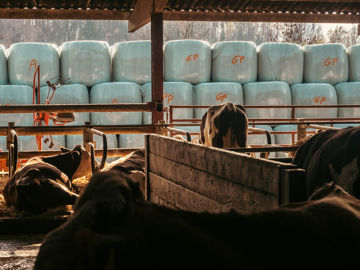 Ce n’est qu’en 2011, avec le prêt JA d’Olivier remboursé, que la construction d’une stabulation adaptée à la taille du troupeau (34 montbéliardes pour 280 000 litres de lait à l’époque) a pu être envisagée. Pour réduire les coûts et se garder des perspectives d’évolution, Olivier a opté pour une stabulation en aire paillée intégrale avec vaches et génisses en vis-à-vis. Le bâtiment était équipé d’une salle de traite 2 x 6 en épi 60° et d’une nurserie avec Dal pour 30 veaux. À proximité, deux hangars de stockage pour le fourrage et le matériel, ainsi qu’un silo de maïs ont été construits. L’investissement total s’est élevé à 450 000 €.