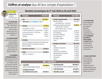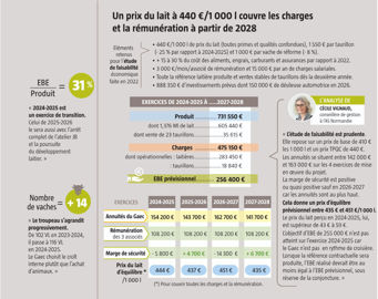 Les jeunes éleveurs établissent leur stratégie de gestion sur un minimum de 250 000 € à 255 000 € d’EBE pour assurer 108 000 € de rémunération des associés (dont Bertrand jusqu’en août 2029) et 145 000 € d’annuités. « Nous avons fixé les prélèvements privés à 3 000 € par mois par personne. Il n’est pas question que le bénéfice de notre travail reste dans l’entreprise. La priorité est d’être correctement payés et de couvrir les 1 000 €/mois de remboursement de parts sociales acquises chacun à notre entrée dans le Gaec », affirment-ils. Celui de Romain, installé en 2017, prendra fin en 2026. Avec 228 000 € d’EBE en 2024-2025, l’objectif n’est pour l’instant pas atteint. La Gaec a livré à Mont-Blanc 350 000 l de moins que ce que lui permet sa référence contractuelle. Il prévoit de combler deux tiers de ce retard en 2025-2026. « Ce n’est pas un retard, corrige Romain. 2023 a été mouvementé. À cause de problèmes de santé, nous n’étions que mon père et moi à gérer le quotidien, contre 3,5 UTH habituellement. Nous avons dû diminuer le troupeau de 20 vaches, qui de ce fait a un peu vieilli. Le remonter sans acheter d’animaux demande du temps. »