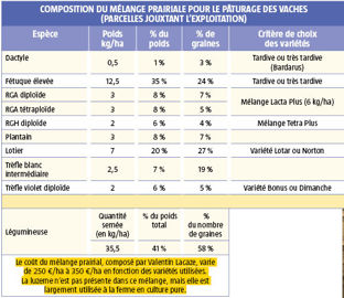 Sur la partie alimentation, l'avis de Valentin est sans appel : « Je préfère que mes vaches aillent ramasser l’herbe plutôt que de sortir le round-baller ! » Son système s’appuie essentiellement sur les légumineuses dont la luzerne pour maximiser l’autonomie. « Quand je n’ai plus d’herbe, la luzerne est toujours verte. Certains éleveurs ouvrent leur botte d’enrubannage en période estivale, moi pas. Je n’ai pas peur de la faire pâturer : la nuit toujours (pas de photosynthèse), à un stade avancé (en fleurs) et avec une bonne clôture en fil arrière car la luzerne fraîche est, elle, dangereuse (météorisation). Ici quand il n’y a plus rien à manger en août, que tout est grillé, il n’y a vraiment rien, à part entamer les stocks d’hiver et moi je veux produire du lait le moins cher possible ! » Il maximise aussi l’aide couplée aux légumineuses (Pac) qui payent les semences : « Et une bonne partie du lait produit est fait là, sans me coûter bien cher ! » Sans son enrubannage, Valentin estime une baisse de production moyenne de l’ordre de 3 litres/jour/vache. Le méteil ? « J’ai testé mais ce n’est pas mon truc. Trop fibreux et trop pénible à faucher ! »