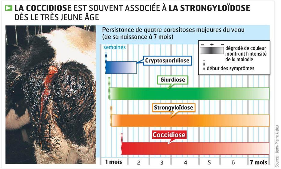 Si elle n'a pas de lien direct avec la cryptosporidiose et la giardiose, la strongyloïdose (contamination orale du veau par le colostrum ou transcutanée sur des litières souillées) s'avère très souvent liée à la coccidiose. Sa prévalence maximale se situe entre un et trois mois d'âge. L'élevage en bâtiment humide et chaud sur litière accumulée fait souvent le lit du duo « strongyloïdose- coccidiose ». De même, l'infestation par la toxocarose (Ascaris) en bâtiment et par les strongles gastro-intestinaux en pâture (Ostergia, Cooperia) constitue une situation à haut risque de coccidiose.
