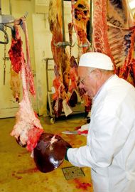 - L'abattage d'urgence à la ferme concerne les bovins qui ne peuvent pas se déplacer seul. Le vétérinaire doit être présent pour faire une inspection ante mortem et délivrer un certificat vétérinaire d'information. Une fois l'animal abattu, l'éleveur achemine la carcasse non dépouillée et les viscères à l'abattoir. Si le délai entre l'abattage et l'arrivée à l'abattoir est supérieur à deux heures, le transport doit être réalisé à l'aide d'un camion frigorifique. La carcasse est ensuite inspectée par les services vétérinaires.
