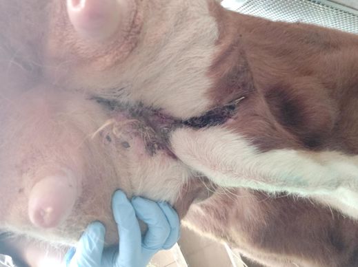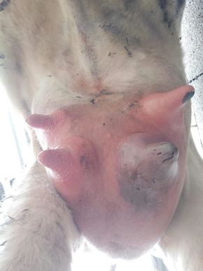 Abordons aussi le cas des mammites gangréneuses. Assez rares, elles sont importantes à déceler très rapidement car le pronostic vital de l’animal est en jeu. Provoquées par un staphylocoque doré, elles peuvent se développer en quelques heures seulement et se caractérisent par un quartier bleu et froid (voir photo ci-dessous), avec un lait très modifié, malodorant et un animal abattu. L’urgence médicale consiste à administrer sans attendre un traitement antibiotique, associé à de la fluidothérapie (perfusion, drenchage) afin de sauver l’animal. Une fois l’urgence gérée, dans tous les cas le quartier atteint tombe, laissant souvent une plaie béante.
