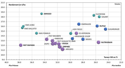 - les rendements, leur stabilité (écart-type ET qui permet d'apprécier la stabilité relative des classements entre variétés en 2025) et leur régularité (exprimés en valeur relative obtenues au cours de plusieurs années), la vigueur au départ.