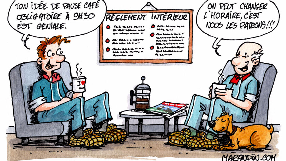 En routine, une journée de travail est définie de 7 heures à 19 heures. Les deux associés se retrouvent à 9 h 30 pour le café. Ils rentrent dans le bureau en chaussons. Dans la mesure où ils conduisent ensemble le troupeau et les cultures, ils inscrivent cette pause matinale comme étant indispensable, en particulier celle du lundi, où ils établissent le programme de la semaine, validé sur un agenda partagé, rendez-vous personnels et congés compris. Celle des jours suivants et les échanges d’informations par WhatsApp ajustent les décisions. Le téléphone portable est proscrit pour favoriser l’écoute de l’autre. Jean-Michel et Antoine réalisent ensemble le ménage du bureau tous les vendredis avant de se quitter. Ils sont libres un week-end sur deux du vendredi soir au lundi matin.