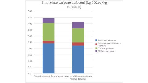 Dans l’hypothèse d’une tonne de carbone à 50 euros, la politique de mise en réserve de terres induirait une baisse de la consommation de 14 %, une hausse de prix de 15 % et la mise en réserve de 1,03 million d’hectares, soit 3,6 % de la surface agricole française. Les émissions sur l’ensemble du secteur deviendraient négatives : 3,16 millions de tonnes de CO2eq évitées par an.