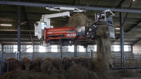 8. Il soigne ses Aubracs sans tracteur, avec une pailleuse distributrice sur rail