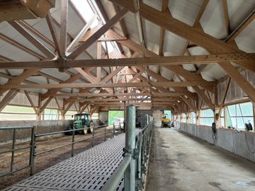 De fin octobre à début mai, les laitières vivent à l’intérieur et la ration se compose de foin, de farine d’orge et d’un peu d’aliment. « Autour de l’exploitation, nous disposons surtout de prairies naturelles, mais 100 ha sont labourables. Elles sont pâturées au printemps puis fauchées », précise François. Un épandage de lisier est réalisé au printemps. Les éleveurs ont investi dans une tonne à lisier équipée d’un canon, ce qui permet d’arroser les surfaces difficilement accessibles.