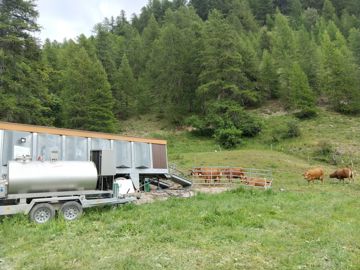 La traite s’effectue donc en alpage pendant tout l’été. Une salle de traite mobile a été acquise en 2018 pour 140 000 €. Il faut compter 180 000 € pour un équipement équivalent aujourd’hui. Elle est déplacée au tracteur une vingtaine de fois pendant la saison. « On suit l’herbe », indique François. Damien monte à 5 h 45 et rassemble les vaches dans un parc. François le rejoint vers 6 h 45 et la traite leur prend une heure avec une 2 x 6. Les vaches reçoivent du concentré et de la farine d’orge pendant la traite. « Mon père trayait aussi en extérieur. Avec d’autres éleveurs, il a tiré 8 km de tuyaux de 25 mm de diamètre pour alimenter différents points de traite en eau potable », se souvient François. La salle de traite est équipée d’une réserve d’eau, d’une pompe et d’un surpresseur. L’ensemble est alimenté par un groupe électrogène. L’installation est donc autonome pour assurer son nettoyage avec de l’eau froide et chaude, ainsi que les détergents nécessaires. Le tank à lait se trouve sur une remorque et redescend à la ferme tous les deux jours pour la collecte.