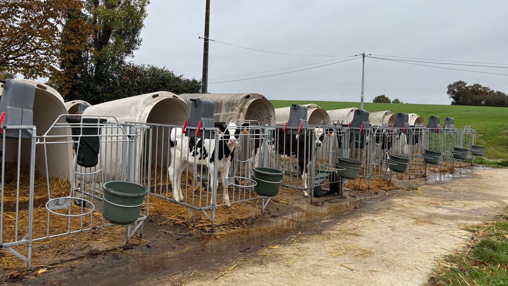 Les veaux reçoivent 5 à 6 litres de colostrum dans les deux heures suivant la naissance. Ils sont d’abord élevés en niches individuelles. L’aliment d’allaitement est équilibré en acides gras, acides aminés et protéines. Il contient un pack de protection intestinale. La distribution du lait se fait avec un taxi lait. Chaque veau a son propre seau, lavé et désinfecté après chaque buvée. Les diarrhées néonatales sont absentes sur l’élevage. Les veaux ont de la paille à disposition et un aliment spécifique pour les génisses qui contient les mêmes niveaux d’acides gras, d’acides aminés et de protéines que le lait. Ceci facilite la transition.